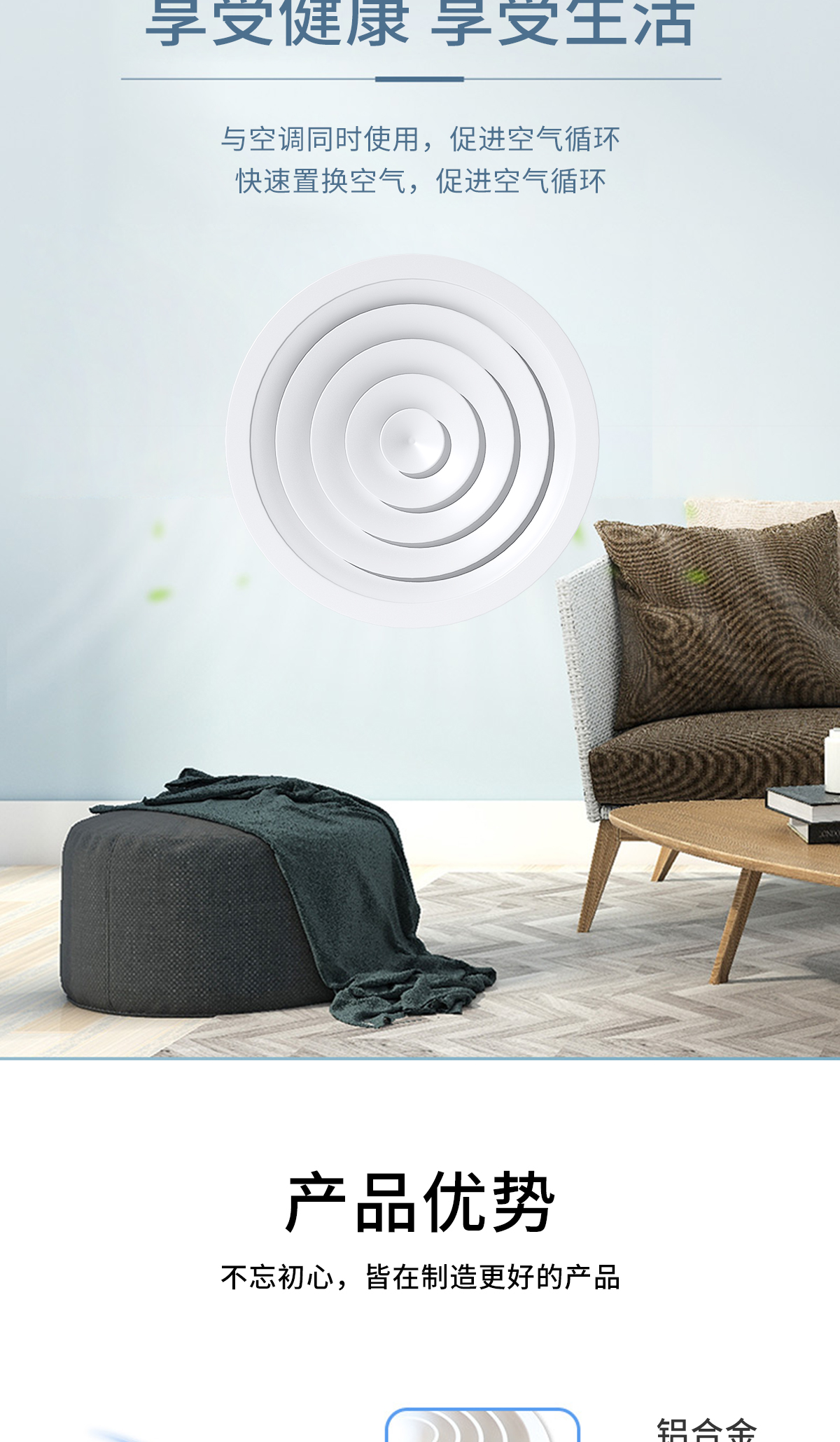 用于冷暖送風,常安裝在頂棚上 吹出氣流呈貼附(平送)型 可以供給較大的風量 在給定風量范圍內擴散半徑可大小變化 可與圓形對開調節閥配套使用
